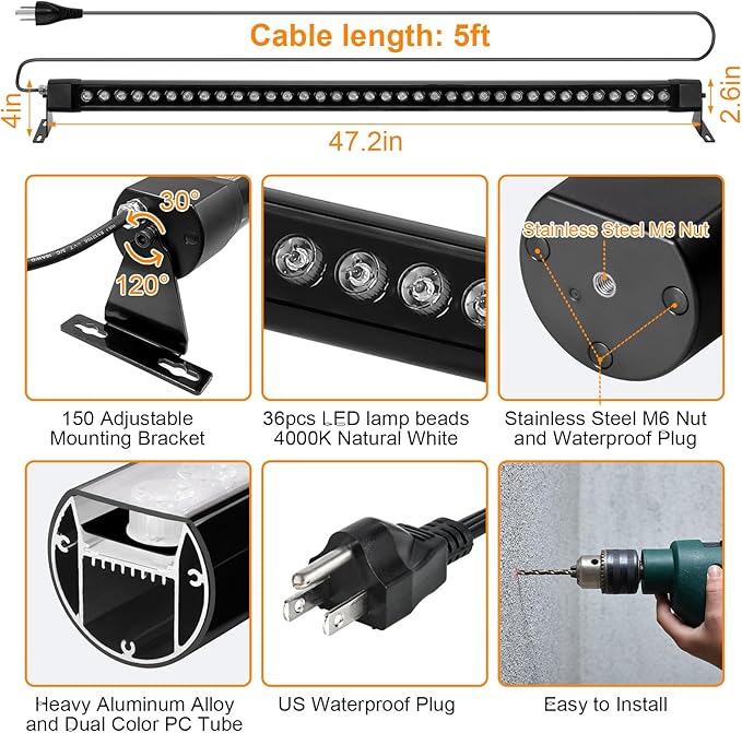 - ใ๐ ๐๐ฌ๐ญ ๐๐ง๐ ๐๐ข๐ฆ๐ฉ๐ฅ๐ ๐๐ง๐ฌ๐ญ๐๐ฅ๐ฅ๐๐ญ๐ข๐จ๐งใ: The 120V LED wall washer light strip is equipped with a 5-foot outdoor waterproof power cord and an American three prong plug, which is convenient for use without wiring. The 150 ยฐ adjustable mounting bracket of the LED light bar can be positioned or suspended in any angle and various scenes you like.