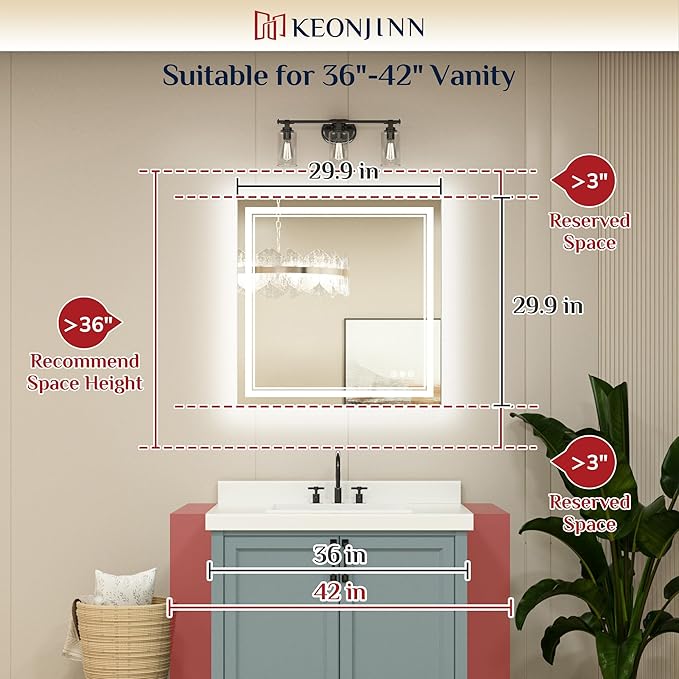 - 【Tempered Glass & Firm Packaging】Keonjinn bathroom mirror with lights feature upgraded tempered glass mirror that delivers high-definition clear imaging. Our led vanity mirror is shatter-proof, corrosion-proof and rust-proof, stronger than ordinary glass mirrors. It is unbreakable and won't shatter into pieces even when broken, safer to use. Meanwhile, our LED mirror's packaging has passed the impact test, drop test and heavy pressure test to ensure that the mirrors arrive safe and undamaged.