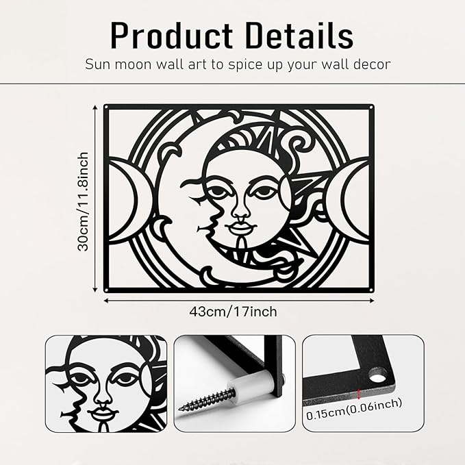 - [Size and Packaging]: Sun and Moon metal mural is about 17 x 11.8 inches/43 x 30 cm,With safety packaging, it is absolutely firm, rust-proof, durable, and smooth edge.
