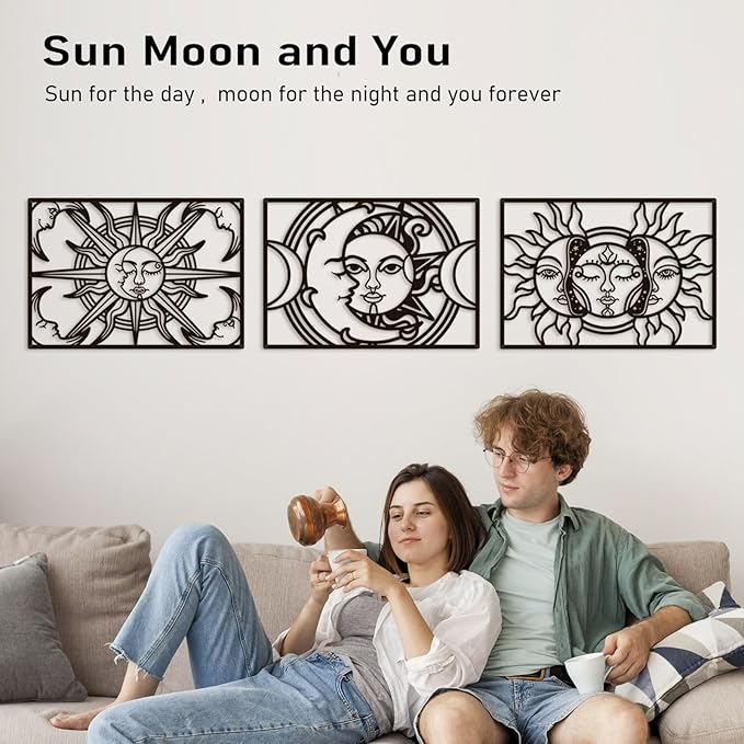 - [Convenient Hanging]: You will receive 3 abstract Sun and Moon metal mural, with 12 screws and other accessories, easy to hang, easy to install and disassemble.