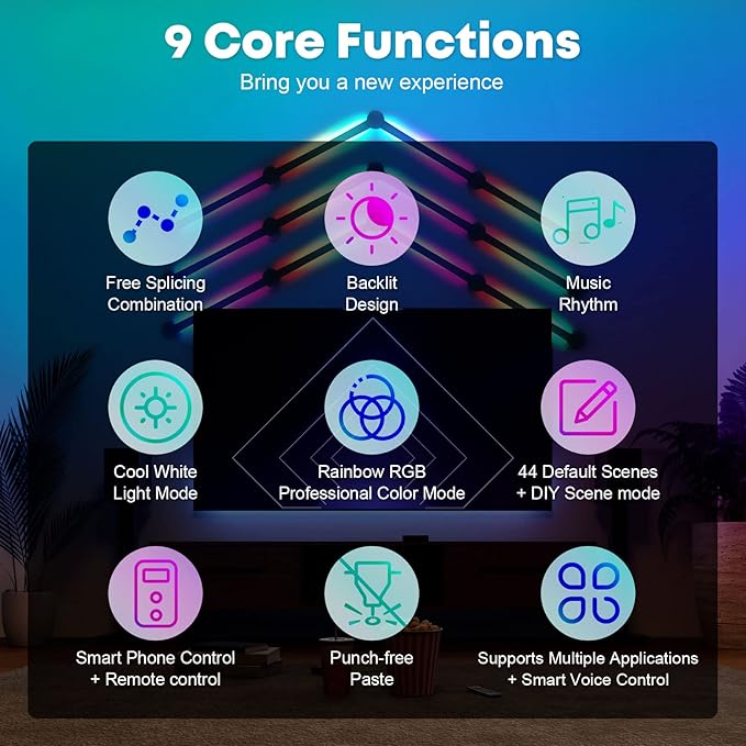 - 【DIY Free Splicing Combination & RGB Dynamic Light Lines】9 Neon Light bars can be freely spliced DIY combination into your favorite pattern wall, add design sense to the monotonous white wall and create a personalized wall pattern. Display 16 million+ RGB colors to create a dynamic atmosphere in the game room, bedroom, living room, etc. and add color to the monotonous space.