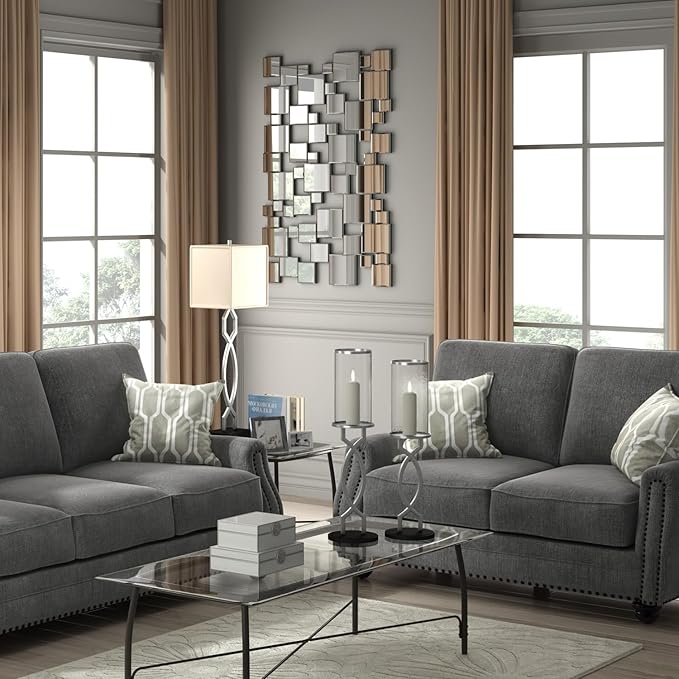 - PRODUCT SIZE: 48X32 inches, Modern Geometric Wall Mirror featuring an intricate arrangement of interlocking square mirrors, The sleek, frameless design adds depth and dimension, reflecting light to brighten dark corners and visually expand your space.