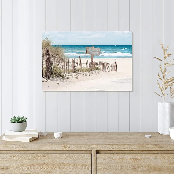 - Size: The beach wall art is 24 x 16 inches. The coastal wall art lends a relaxing coastal vibe to any room. Hanging this canvas wall art beach scenes will add vibrancy to living room, bedroom, bathroom, kitchen, dining room, hallway, or office