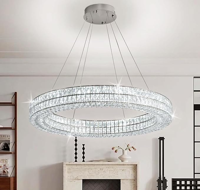 - ✨【Dimmable LED Crystal Ring Chandelier】: Include Built-in 103 Watts High-quality LED ceiling lightstrip, Uo to 9270lumins provides ample liaht.With 3-color temperature changing. Please notethat chandeliers have own dimmers (include),only can be used with reqular wall switches, and isnot compatible with home dimmer switches, You also can use remote(included) andAPP(Lampsmart pro) to switch color temperature as you like from 2700k-6000k and 5%-100%brightness adjustment.DC.Voltage=85-256V.
