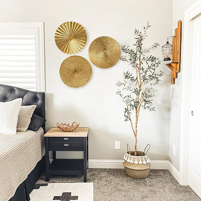 - Add dimension to a plain wall in your home using the gold metalic plates wall decor. Made from 100% metal with unique textured patterns on each plate, this decorative statement piece is eye-catching and unique. Display it alongside pieces of contemporary or transitional decor for a cohesive look.