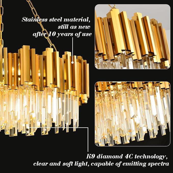 - 【Luxury Gold Modern Chandelier 】This large gold modern crystal chandelier is designed in K9 clear crystals , adds more luxury elements to your home decor, and more luxurious effect, when the chandelier lights up,all the effort will be transformed into your happy mood.The modern chandeliers for living room can bring a elegant atmosphere to light up your beautiful home.