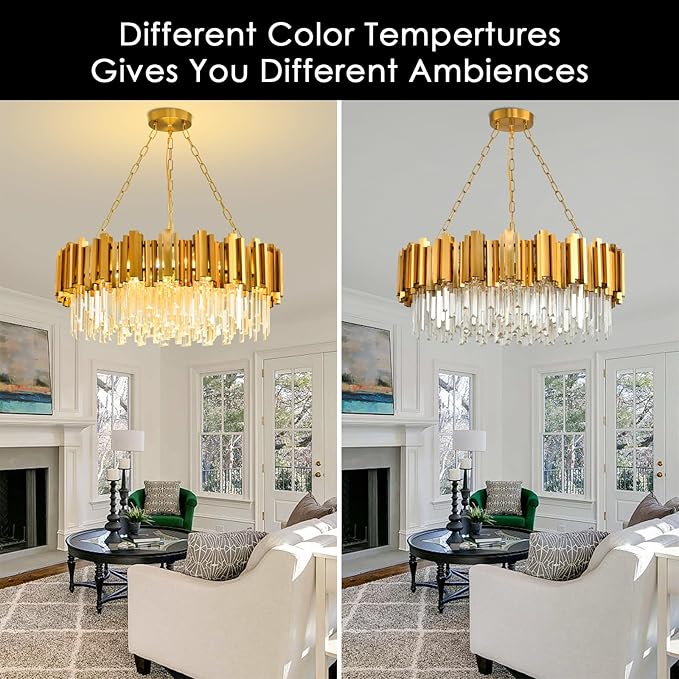 - 【Stunning Gold Crystal Chandeliers Lighting】: The size of round hanging light fixture is D28.4in*H12.59in, 31.5Inch Chain (Adjustable), Luxury farmhouse Crystal Chandelier,E12 *12Lights(Max 40-watt per bulb,Not Included). the whole ceiling light Lighting is Compatible With Dimmable LED, Energy saving, Halogen Bulbs.