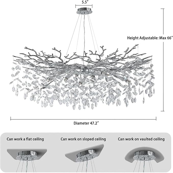 - 【Ideal For Home Lighting】This tree branch chandelier is perfect for dining room, living room, bedroom, foyer, entryway and kitchen. It’s also compatible with both flat and sloped ceilings. It’s like a sparkling silver tree that can light up and warm your entire home. With its refined silhouette, it adds a sense of grandeur, making it a standout piece that complements a variety of interior styles.