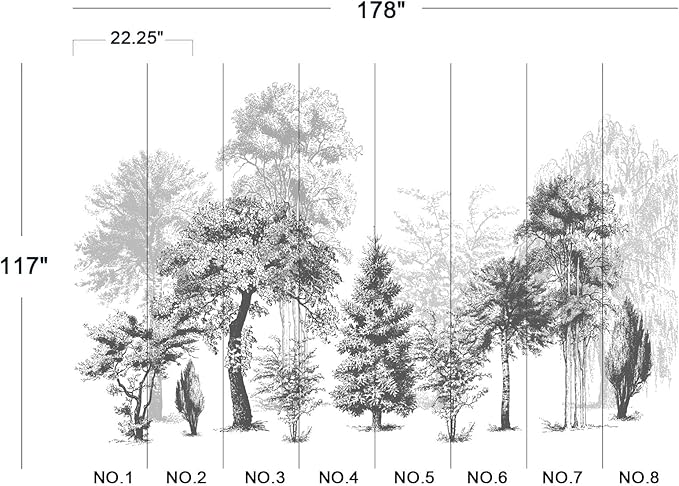 - The size of the wallpaper is 178" wide x 117" high and divided into 8 panels.