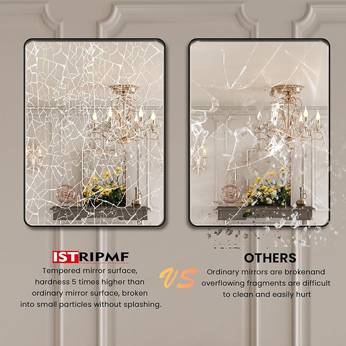 - High-quality Metal Framed Mirror: With round corner metal frame, ISTRIPMF black bathroom mirror are designed with high-grade alumium alloy frame. Anodizing process makes the metal frame waterproof and antirust, durable and non-deformed shape;