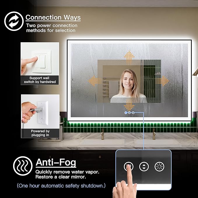 - 【Easy to Install & Powered by Plugin or Hard-wired】Fixed the mirror bracket on the wall by screws and hang the mirror on the holder. You can use the plug for power or connect the wire to wall switch by hard wire. It's better done by a professional electrician if you want to hardwire it.