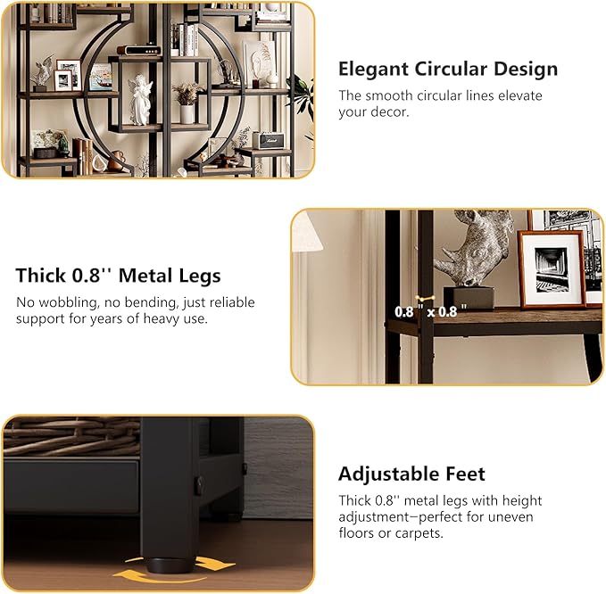 - 【Industrial Farmhouse Design】Crafted with a sleek black metal frame and scratch-resistant grey reclaimed wood, this bookshelf blends industrial geometric style with farmhouse charm. The half-moon open design adds a modern touch, perfect for displaying books, decor, and more in living rooms, offices, or bedrooms.