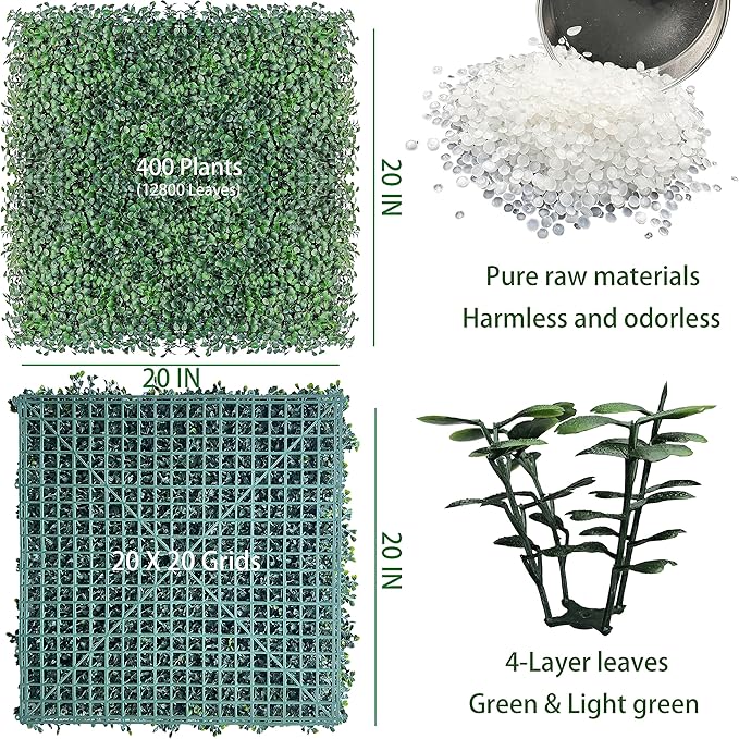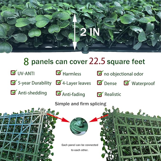- Each package has 8 boxwood panels, each grass panel is 20x20 inches, which can cover 22.5 sqft. The height of the fake leaves is 2 inches(4-layer leaves), which has a Perfect 3D effect. Each panel has 400 faux leaves, which are dense and can cover the background 100%. Give away 50 new cable ties.