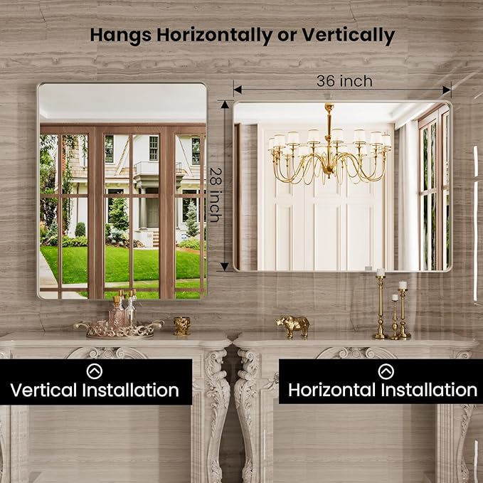 Brushed Nickel Bathroom Mirror 28x36 Inch, Brushed Silver Metal Frame Mirror Wall Mounted, Rounded Rectangle Bathroom Vanity Mirror, Tempered Glass, Anti-Rust, Horizontal/Vertical