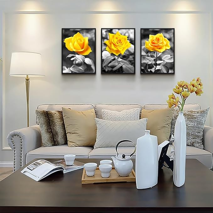 Black Framed Wall Art For Bedroom Living Room Wall Decor For Kitchen Office Decor Black And White Artwork Pictures Yellow Rose Flowers Print Frame Wall Painting Modern Room Home Decoration 3 Piece