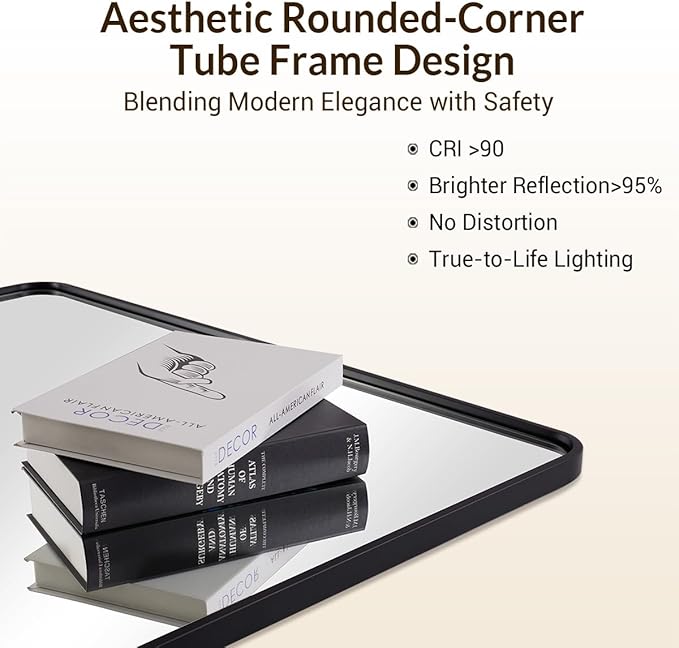 - Premium Quality: Our rustproof mirror is made with premium metal framing and 4mm HD glass, supported by a 9mm MDF backboard for shatterproof protection. The plate glass mirror floats in a thin 1/17" gap with a rounded corner design to soften your space