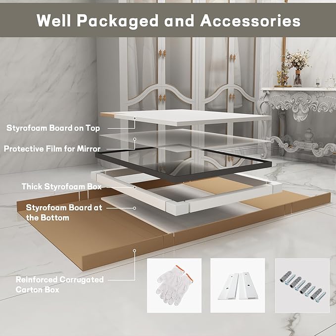 - You Are Very Important: To make sure our bathroom mirror arrives intact, the package is securely designed for shipping with all-around protective Styrofoam, all have passed drop test, no worry breakage. To protect the mirror surface, we cover it with a protective film, please remove the film before using our mirror. LUSABE grows up with you, we invest a lot of personnel and time in the pre-sales, in-sales and after-sales process, we will provide support all the time.