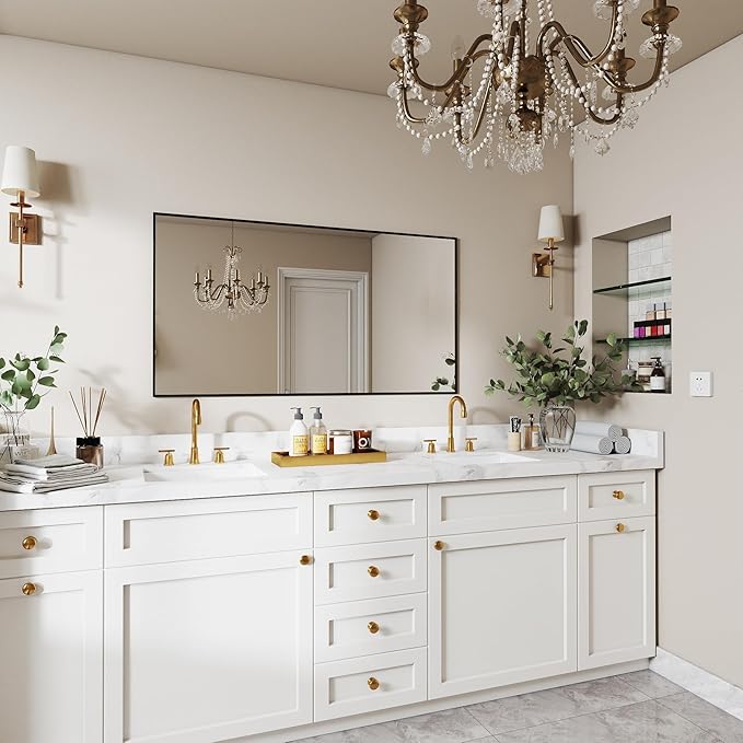 - Easy To Install: Designed with 4 built-in slots on the back, just drive the screws into the wall and chose two holes to hang the mirror on the screws, and you can hang this bathroom vanity mirror horizontally or vertically, very easy to install. NOTE: The bigger size mirror is heavy and for your safety, at least two people are required for installation then.