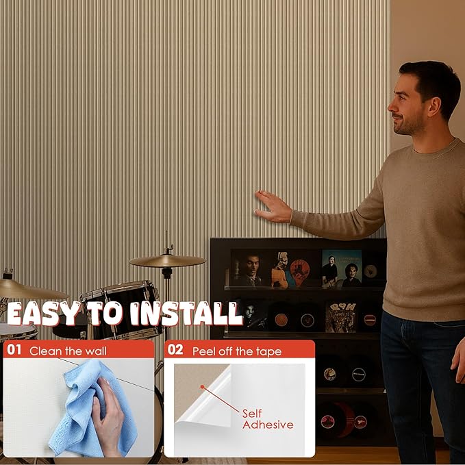 - đťăEASY INSTALLATIONăSuper easy to install! With the self-adhesive design, you just need to tear off the top liner on the back and stick the sound proofing panels to the wall.