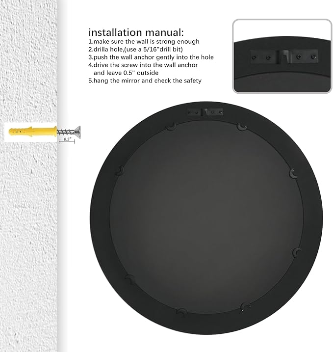 - 【Easy to Hang】 You can either lean this circle mirror against the wall or hang it on the wall. The installation is straightforward, using the screws provided in the package and following the instructions, with just 3 simple steps to complete the setup