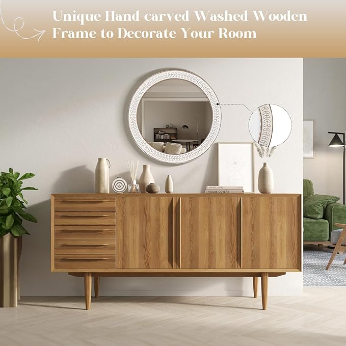 - 【Wooden Frame with Leaf Texture】 The circle mirror's frame is made of solid wood material, ensuring durability and longevity. The hand-carved leaf patterns combined with a white wash distressed finish, and the classic farmhouse design, complement rustic, coastal, boho, vintage, or retro styles.