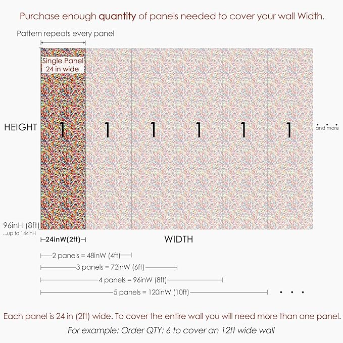 - FIT ANY SIZE: Our wallpapers are sold by the panel, and all panels of wallpaper are custom printed. Each panel is 24" inches wide with an additional 3/4" for an overlap. Select the HEIGHT option and panel QUANTITY based on your project WIDTH and HEIGHT measurements.