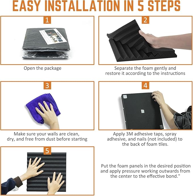 - Sound Insulation Soundproof Foam. - We sell noise cancelling foam panels are non-adhesive. So We recommend using 3M Double Sided Foam Tape that with strong adhesive or pin to install them. Perfect for home studios, offices, gaming rooms, and more, these panels can also good to diy ,you can cut to fit custom shapes and sizes. Please note: Products are packaged in a compressed state.For some products that cannot expand well, they will take longer to expand naturally. Or just put the product in the dryer for a few minutes to expand it to its original shape.
