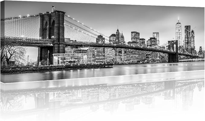 Canvas Wall Art Print New York Cityscape Wall Art for Bedroom Brooklyn Bridge Panorama Wall Decor Art Paintings City Reflection Modern Giclee Artwork for Office Home Decor Ready to Hang 12x46 Inch