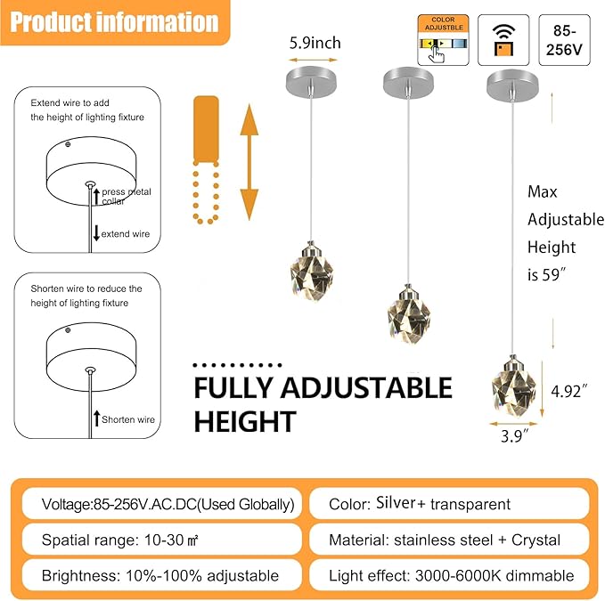 - ✨【Mini Pendant Light Size】:Crystal size:Dia3.9 INCH*4.92INCH(10CM*12CM).Pendant Light Chassis: 5.9 inches (about 15 cm) wide ;Max Adjustable Cord Length:59 inches (about 150cm).