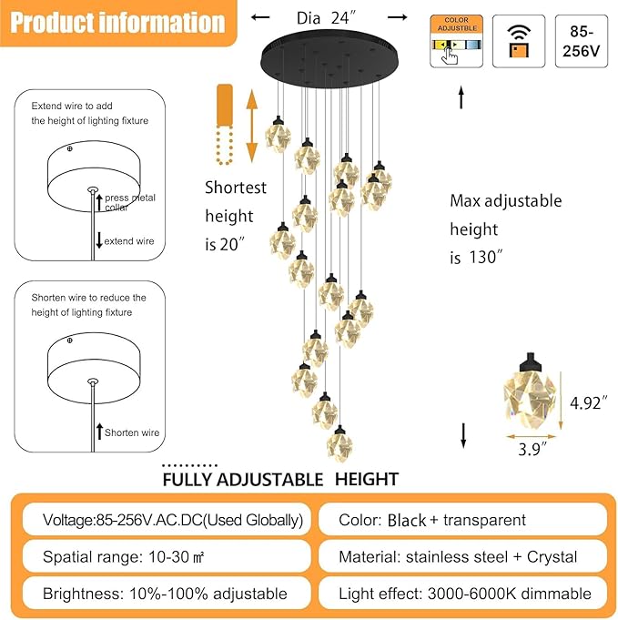 - ✨【Modern led crystal chandelier size】L24'' X W24'' X H130''. Pendant cord is adjustable.The whole lamp is 130''(10.3feet)tallest. The shortest height is 20inches wide and the voltage can be anywhere AC85-256V.
