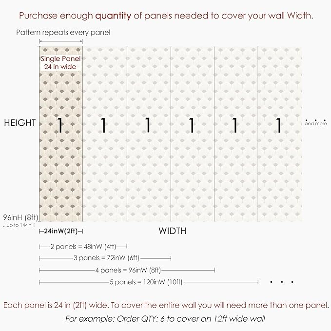 - FIT ANY SIZE: Our wallpapers are sold by the panel, and all panels of wallpaper are custom printed. Each panel is 24" inches wide with an additional 3/4" for an overlap. Select the HEIGHT option and panel QUANTITY based on your project WIDTH and HEIGHT measurements.