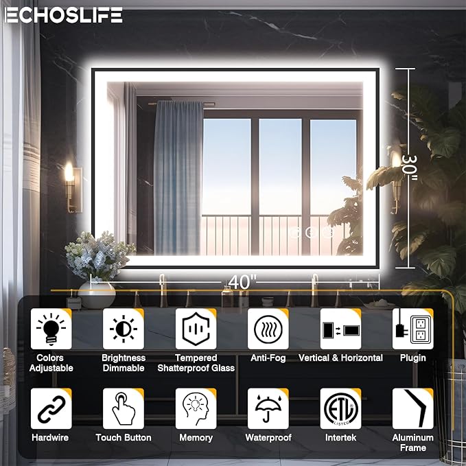 - [Ease of Assembly] EchosLife's lighted bathroom mirror features excellent mounting systems with typical "ledge" design that will never dislodge, making installation a breeze.
