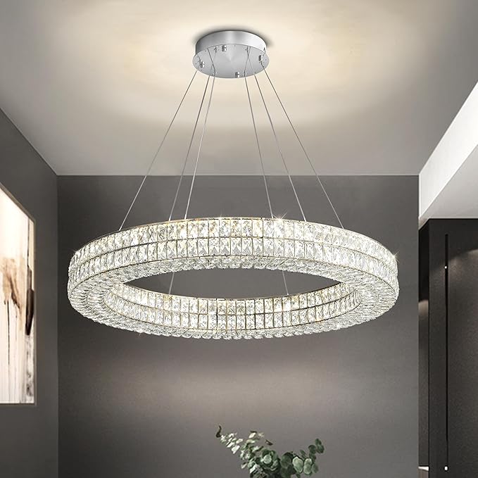 - ✨【Dimmable LED Crystal Ring Chandelier】: Include Built-in 45 Watts High-quality LED ceiling lightstrip, Uo to 4050 lumins provides ample liaht.With 3-color temperature changing. Please notethat chandeliers have own dimmers (include),only can be used with reqular wall switches, and isnot compatible with home dimmer switches, You also can use remote(included) andAPP(Lampsmart pro) to switch color temperature as you like from 2700k-6000k and 5%-100%brightness adjustment.DC.Voltage=85-256V.