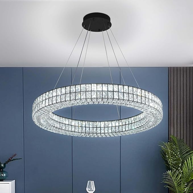 - ✨【Dimmable LED Crystal Ring Chandelier】: Include Built-in 85 Watts High-quality LED ceiling lightstrip, Uo to 7650lumins provides ample liaht.With 3-color temperature changing. Please notethat chandeliers have own dimmers (include),only can be used with reqular wall switches, and isnot compatible with home dimmer switches, You also can use remote(included) andAPP(Lampsmart pro) to switch color temperature as you like from 2700k-6000k and 5%-100%brightness adjustment.DC.Voltage=85-256V.
