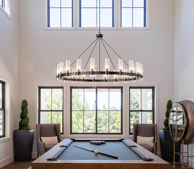 60 Inch Black Round Chandelier, Wagon Wheel Chandelier with Glass Shade, 20-Lights Large Modern Farmhouse High Ceilings Pendant Lighting Fixture for Dining Room, Living Room, Kitchen, Foyer