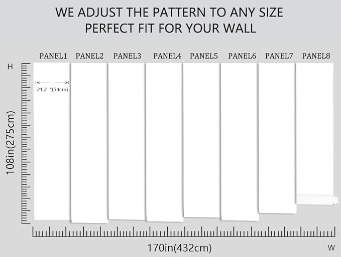 - Our mural is 108 inches tall and 170 inches wide, and to make it easier to transport over long distances, we have divided the width into 8 panels of 21.2 inches each, with a numerical serial number under each section to make installation easier!