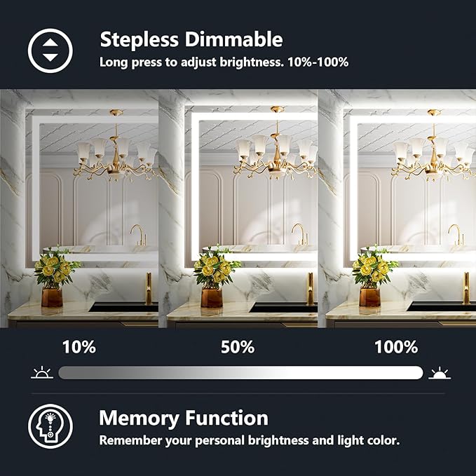 - â¨ăColor Changeable & Brightness Adjustable & Memoryă- Yeelait lighted mirrors for bathroom wall features multiple light settings that are easily controlled with sensitive touch buttons. Short press the button to change the light color: White (6000K) - Neutral (4000K) - Warm(3000K), long press the button to dim the brightness to your comfortable level (100%~10%). The Smart Memory Function will record the lighting setting and keep the previous lighting status after turning off and on.