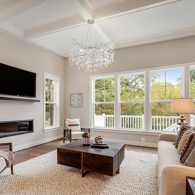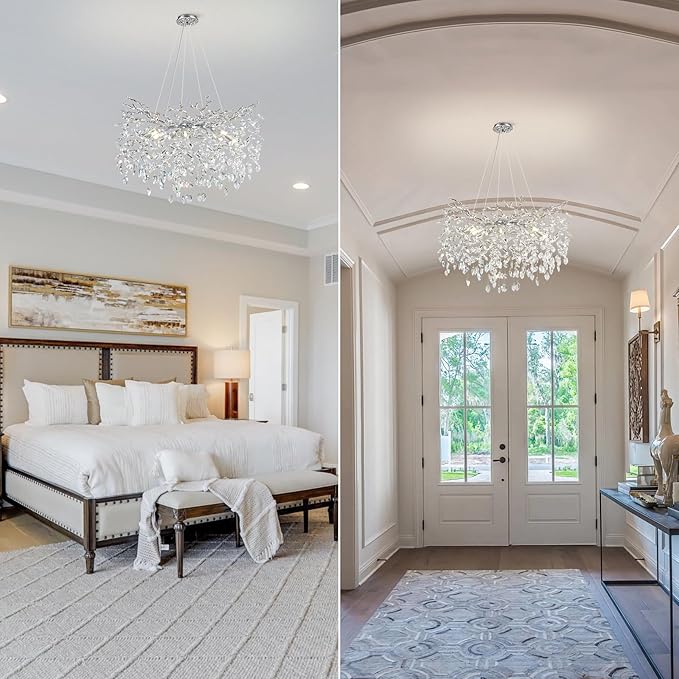- Application Space:This Round Crystal Chandelier Is Like A silver Tree, It Can Light And Warm The Whole House, And It Is Also A Great Decorative Light. The Ceiling Canopy Of The Chandelier Is Compatible With Both Flat And Sloped Ceiling Installations, So It'S Perfect For Dining Room, Living Room, Kitchen Island, Bedroom And Any Other Space.