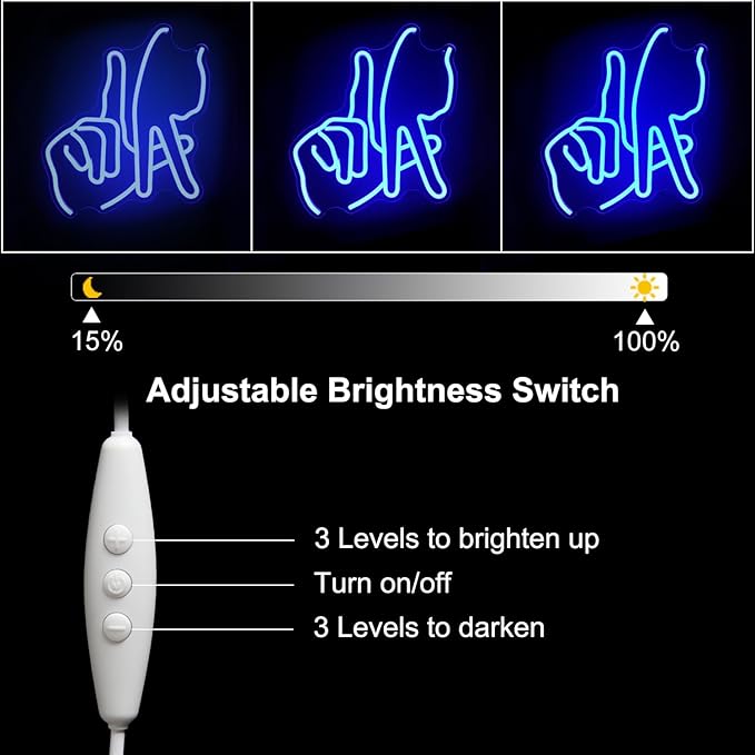 - 【Adjustable Neon Light】The Kullneon LED sign is equipped with a super-intelligent dimming system, which can meet different lighting needs. The middle button to turn ON/OFF the neon wall sign, the UP and DOWN buttons to adjust the brightness of neon lights. The brightness of neon wall light can be adjusted according to your preferences and ambient light.