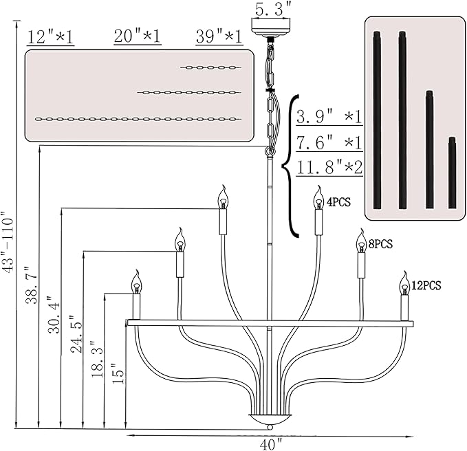 - 【Height Adjustable Chandelier】This Black Chandelier Fixture Features A Unique Three-Section Chain And Four-Section Boom. The Three Sections Of Chain Measure 12 Inches, 20 Inches And 39 Inches In Length. The Total Chain Length Is 71 Inches. The Four-Section Boom Measures 12", 12", 8" And 4" In Length. Overall Boom Length Is 36 Inches. Flexible Height Adjustment As Needed.
