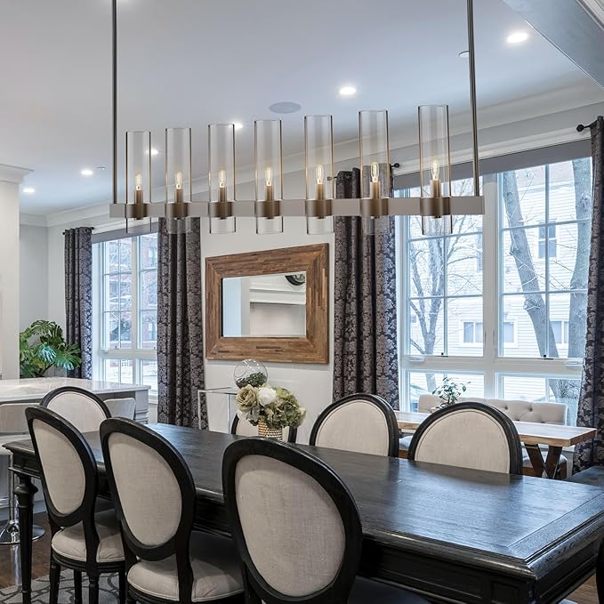 - [Stunning Modern Design] Our 7-light farmhouse linear chandelier is a sleek, linear pendant light fixture that adds an exquisite touch of style and sophistication to your kitchen island or dining room.
