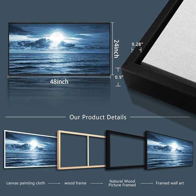 Black Framed Wall Art For Living Room Decorations Photo Prints - Blue Sea View The Moon Landscape - Modern Home Decor The Room Stretched And Framed Ready To Hang Artwork (Blue Ocean&Moon, 24x 48inch)