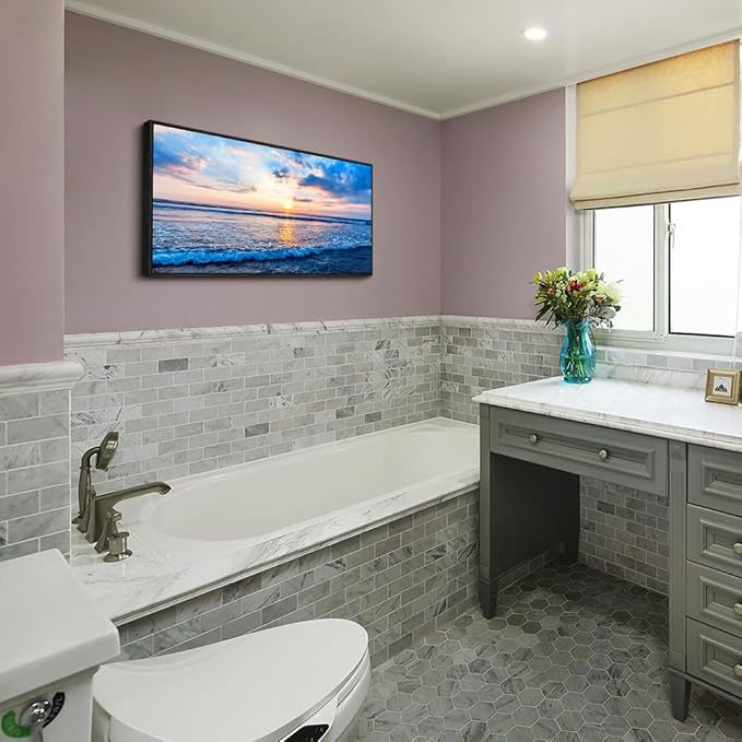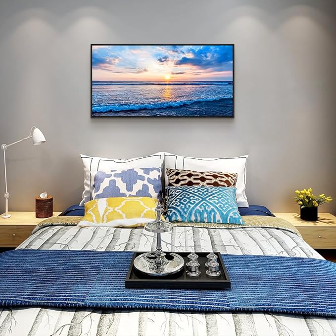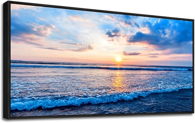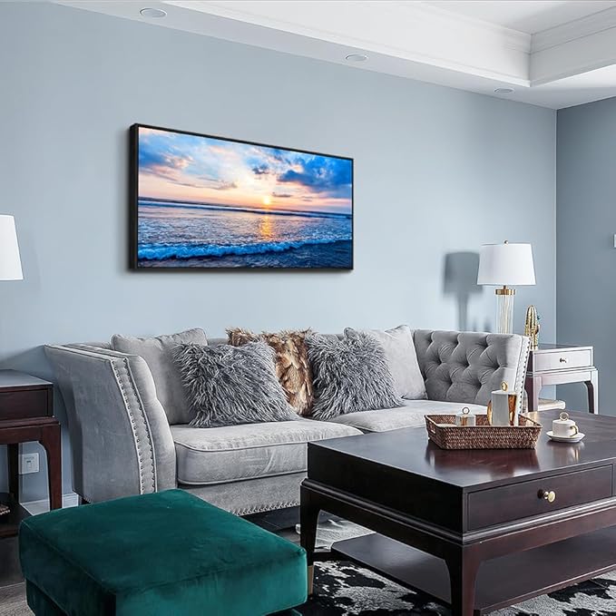 Black Framed Canvas Wall Art For Living Room Blue Beach Ocean Sea Waves Landscape Wall Decor Ready To Hang Home Decorations Bedroom Kitchen Bathroom Canvas Prints Posters Painting Wall Mural Artwork