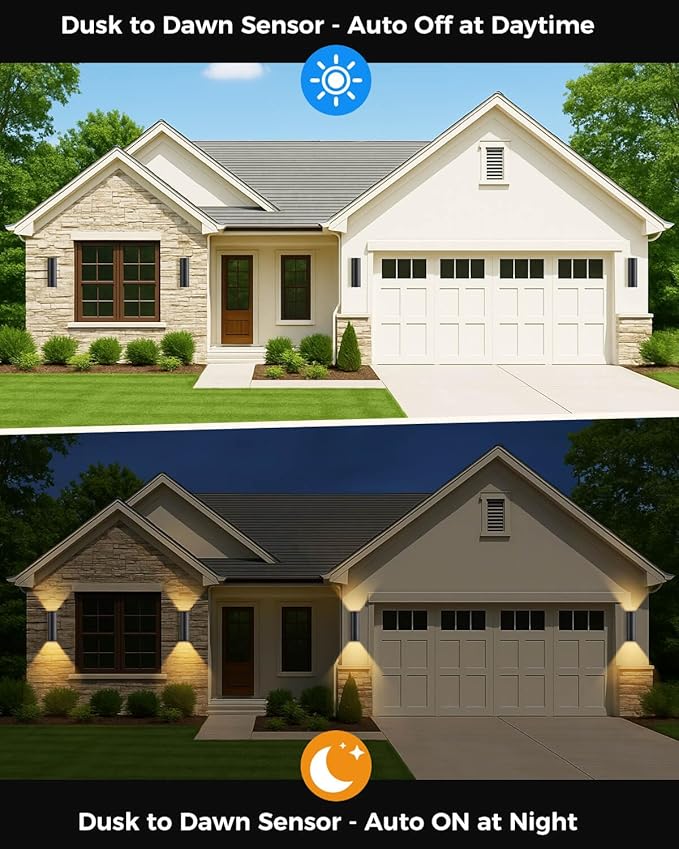 - Smart Auto ON/OFF: This modern outdoor wall light with built-in sensitive photocell sensor. The intelligent sensors detect surrounding brightness, automatically closes at dawn and opens at dusk. Say goodbye to manual operation, saving you time, enjoy a convenient lighting experience.