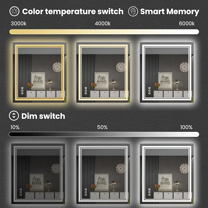 - Three Colors & Dimmable: Single press the led vanity mirror ON/OFF button to change the color temperatures. Also can dimmable the brightness(Both backlit and front light can). With the memory function,the setup will be remembered for your next use;