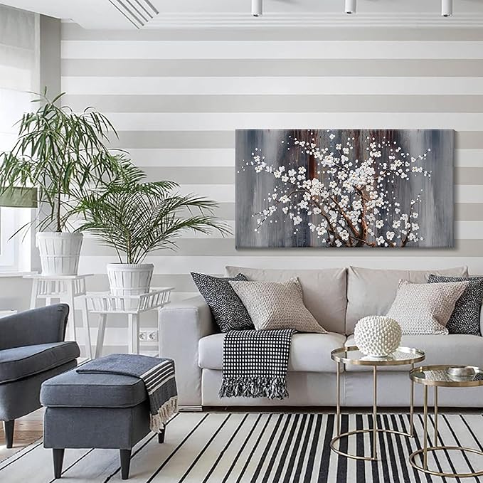 AJAZIKO Wall Art for Living Room Large Modern Wall Decor Canvas Paintings for Wall Decorations White Flower Brown Bedroom Office Artwork Plum Blossom Art Prints Framed