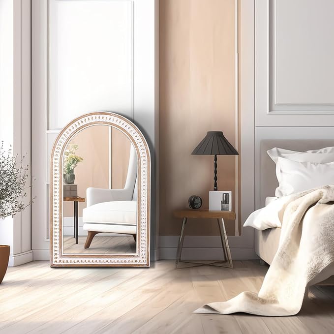 - Boho Style Mirror: This large arch mirror blends practicality with aesthetics, creating an illusion of space and depth in small rooms. Hand-carved wooden beads, combined with a white-washed finish, impart a Bohemian charm that seamlessly complements farmhouse, cottage, country rustic, french country, coastal, boho, vintage, or retro decor.