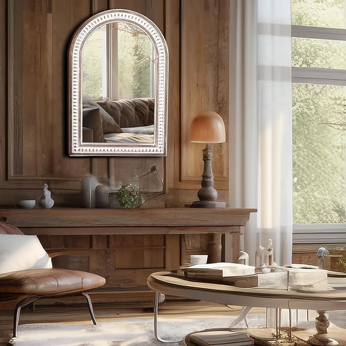- Arched & Beaded Wooden Frame Mirrors: This wall mirrors decorative with an arched and beaded wooden frame, is made of sturdy solid wood with a distressed finish, durable and charming. It can adorn bedrooms, living rooms, offices, hallways, entryways, bathrooms, dining rooms, nurseries, guest rooms, dorms, vanities, powder rooms, country homes, cottages, fireplaces, dressers, and beyond.