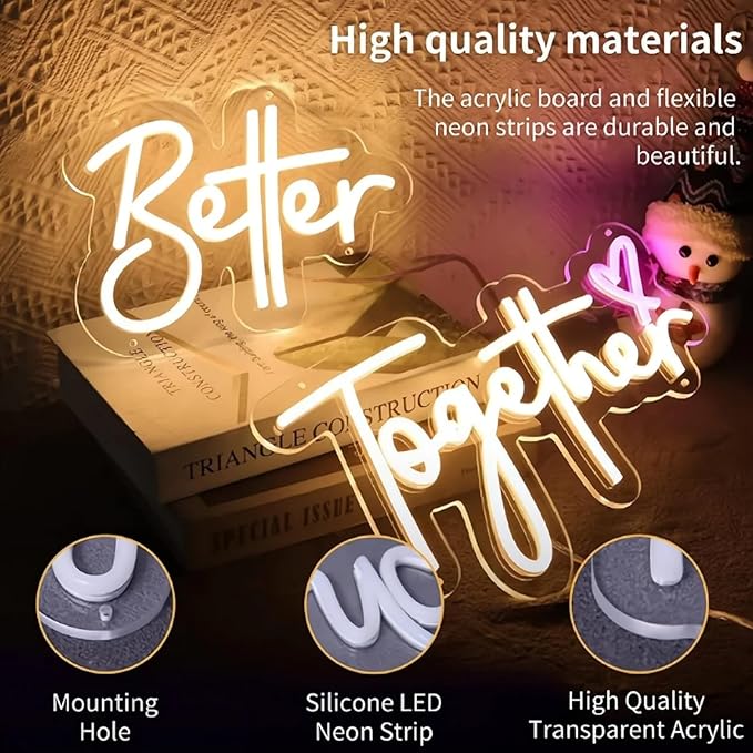 - Better Together - The better together neon sign are the perfect way to show your love and commitment on your wedding day or any special occasion. with its elegant design and warm glow, it makes any room shine with love. neon lights are also a romantic way to brighten up your wedding party, adding impact and emotional ambience to your wedding.