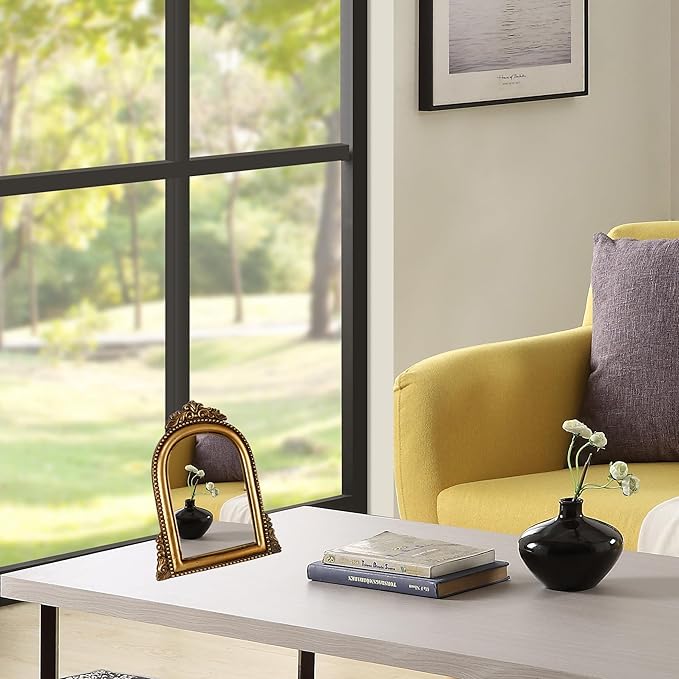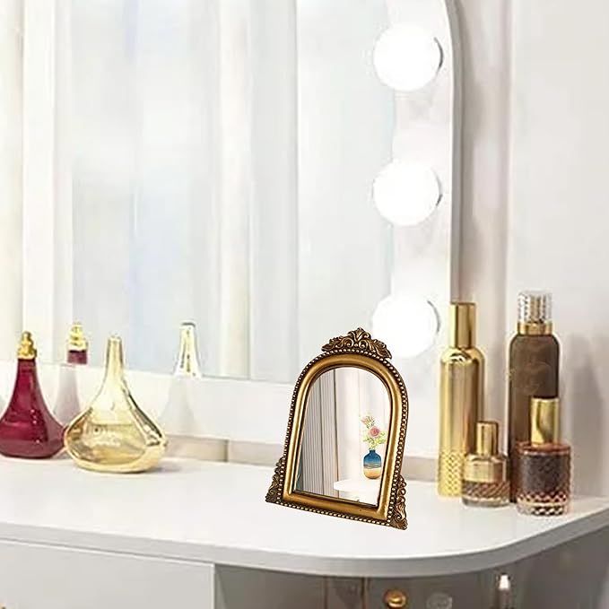 OIGUMR Smaller Vintage Gold Ornate Baroque Mirror Vanity Desk Table Mirror Arched Makeup Mirror with Resin Frame 9.6X6.5 inch